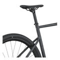 Pneus larges 45 mm + jantes solides : bon grip, stabilité sur chemin, confort sur parcours mixtes.